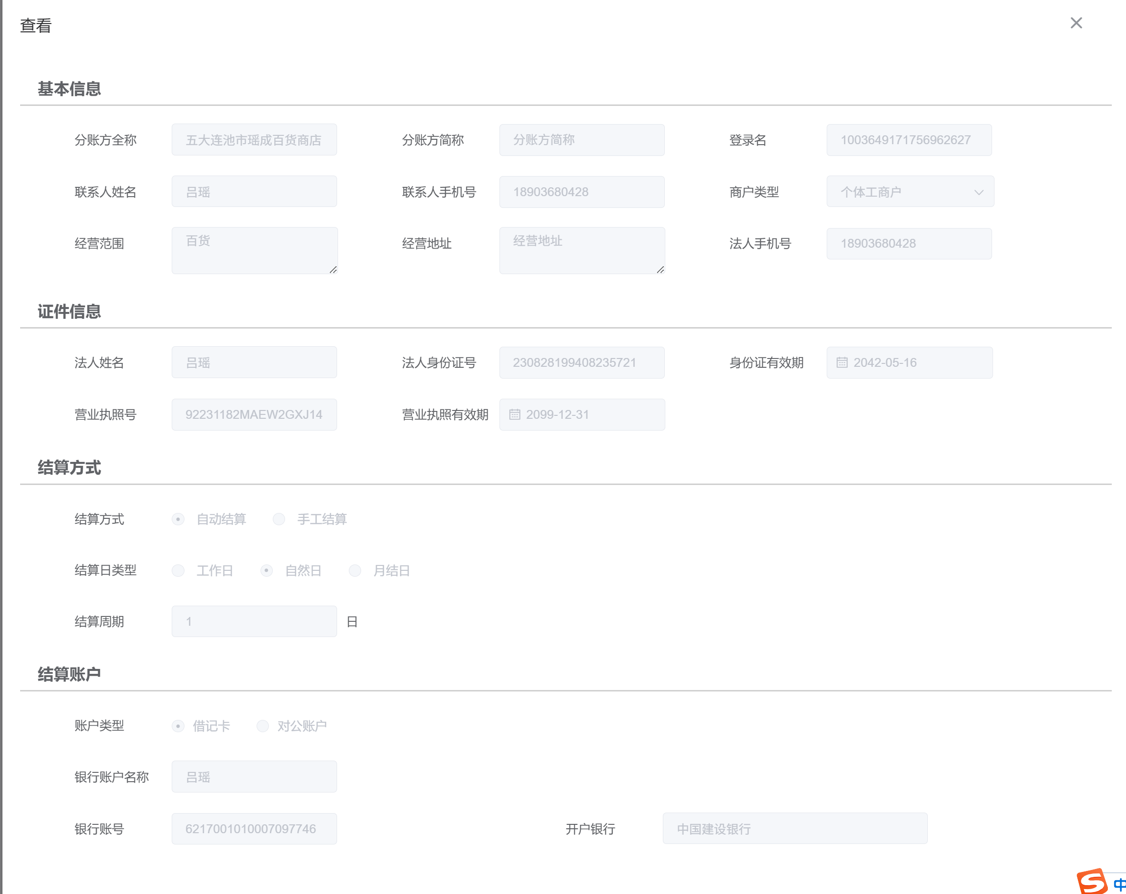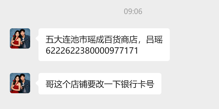 打开五大连池市瑶成百货商店,修改银行卡(提出人:吕俊颖)
