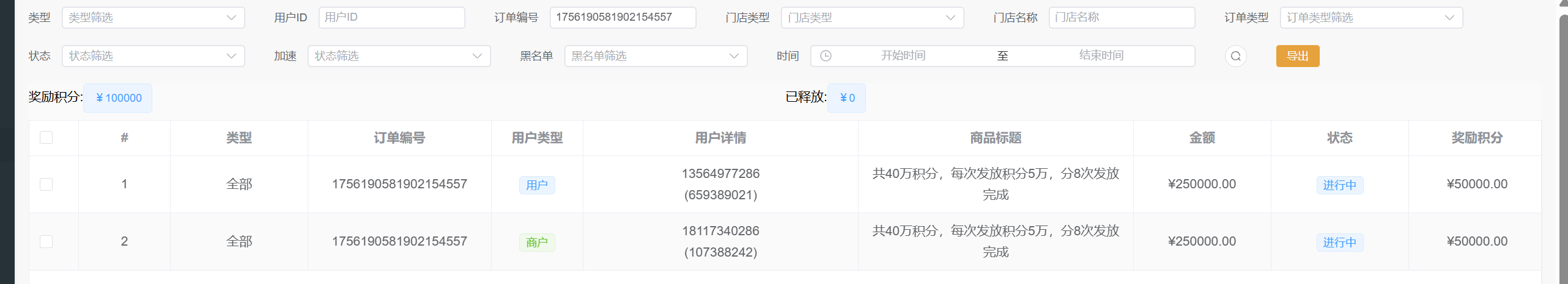 发放订单号:1756190581902154557,商户和用户各发放50000积分